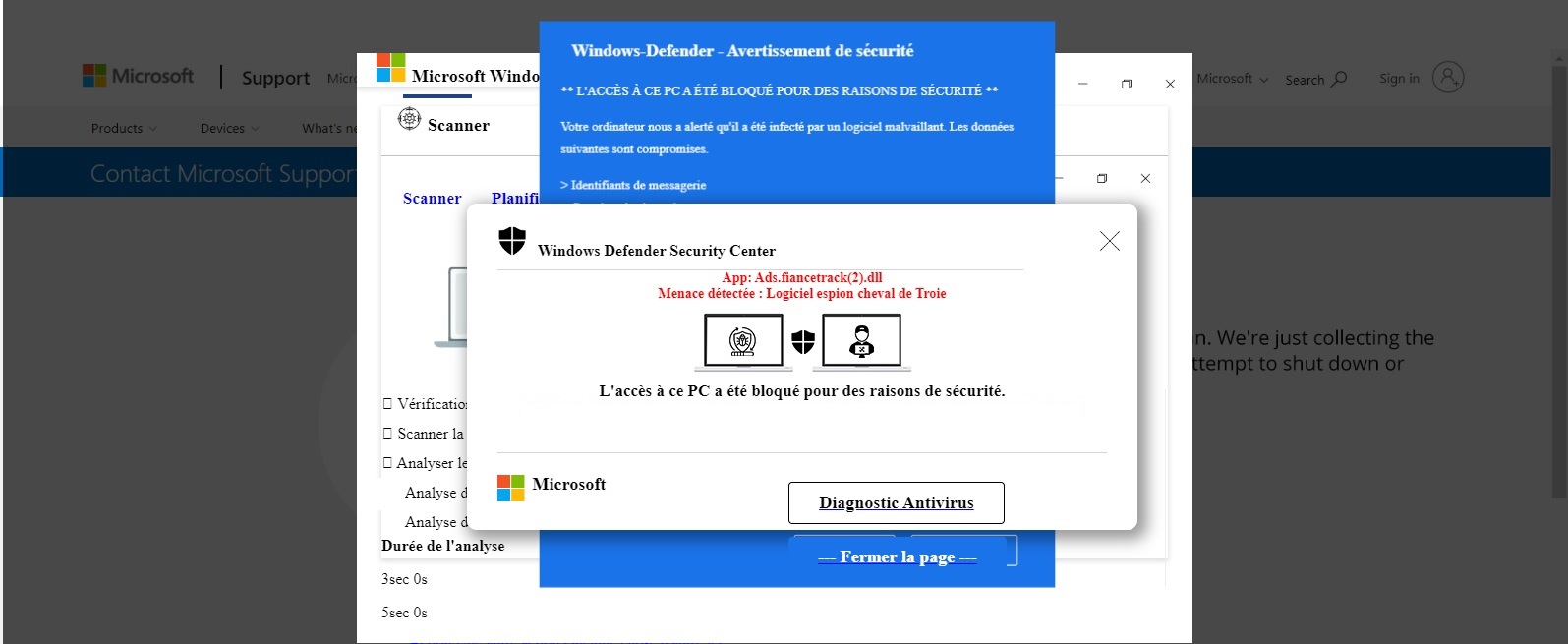 Alerte critique de sécurité :Trojan détecté. un fichier malveillant à altéré votre systéme et à été temporairement bloqué . Pour vous assurez de la sécurité de vos données , procédez immédiatement à un diagnostic antivirus ou cliquez sur "Quitter la page " ou la croix pour afficher plus de détails!